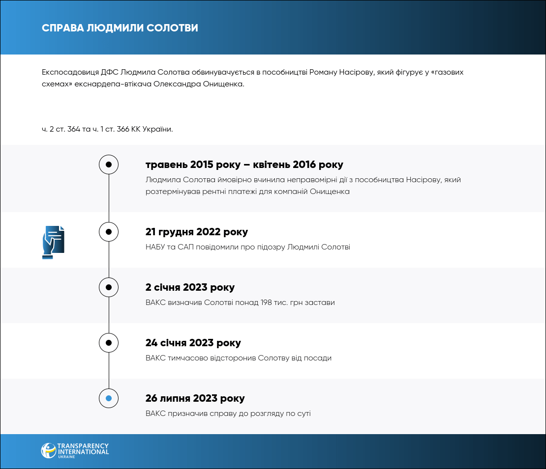 Людмилі Солотві як пособниці інкримінують ч. 2 ст. 364 та ч. 1 ст. 366 КК України.