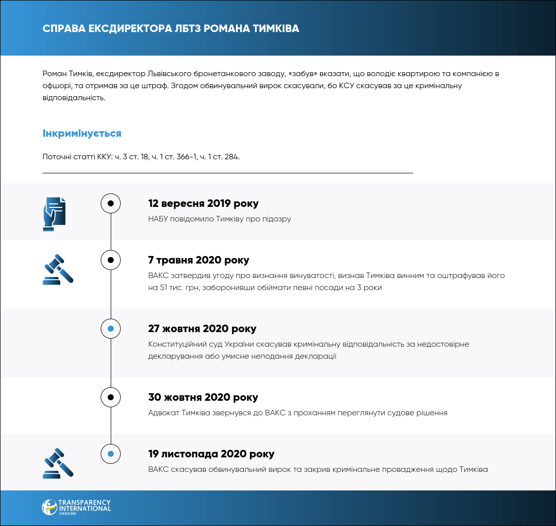 7 травня 2020 року ВАКС визнав винним ексдиректора Львівського бронетанкового заводу Романа Тимківа у декларуванні недостовірної інформації та оштрафував його на 51 тис. грн. Цей вирок згодом було скасовано через скандальне рішення Конституційного суду України, яке скасувало кримінальну відповідальність за недостовірне декларування або умисне неподання декларації.