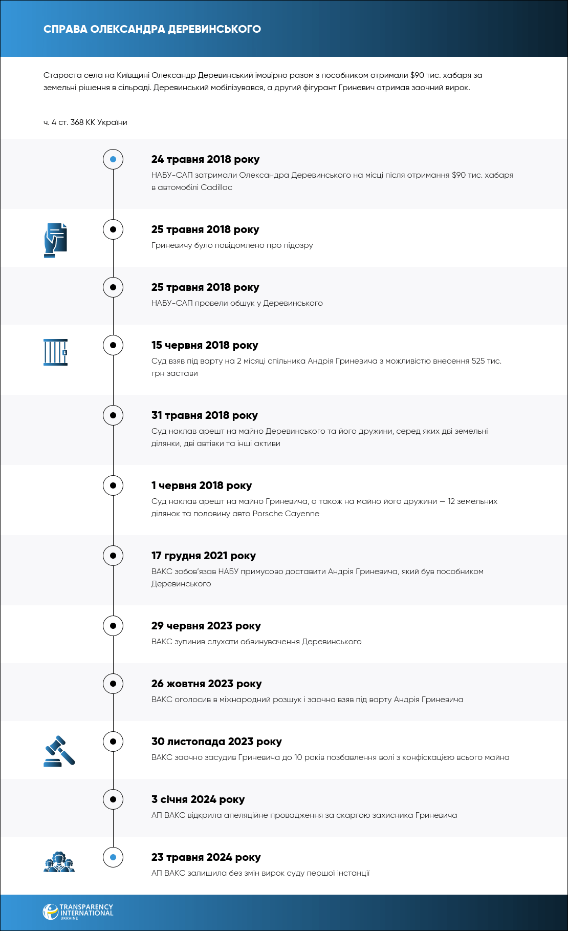 Старосту села на Київщині Олександра Деревинського та його пособника Андрія Гриневича обвинувачують в отриманні $90 тис. хабаря. Останньому оголосили вирок заочно, а слухання стосовного Деревинського призупинені через його мобілізацію.