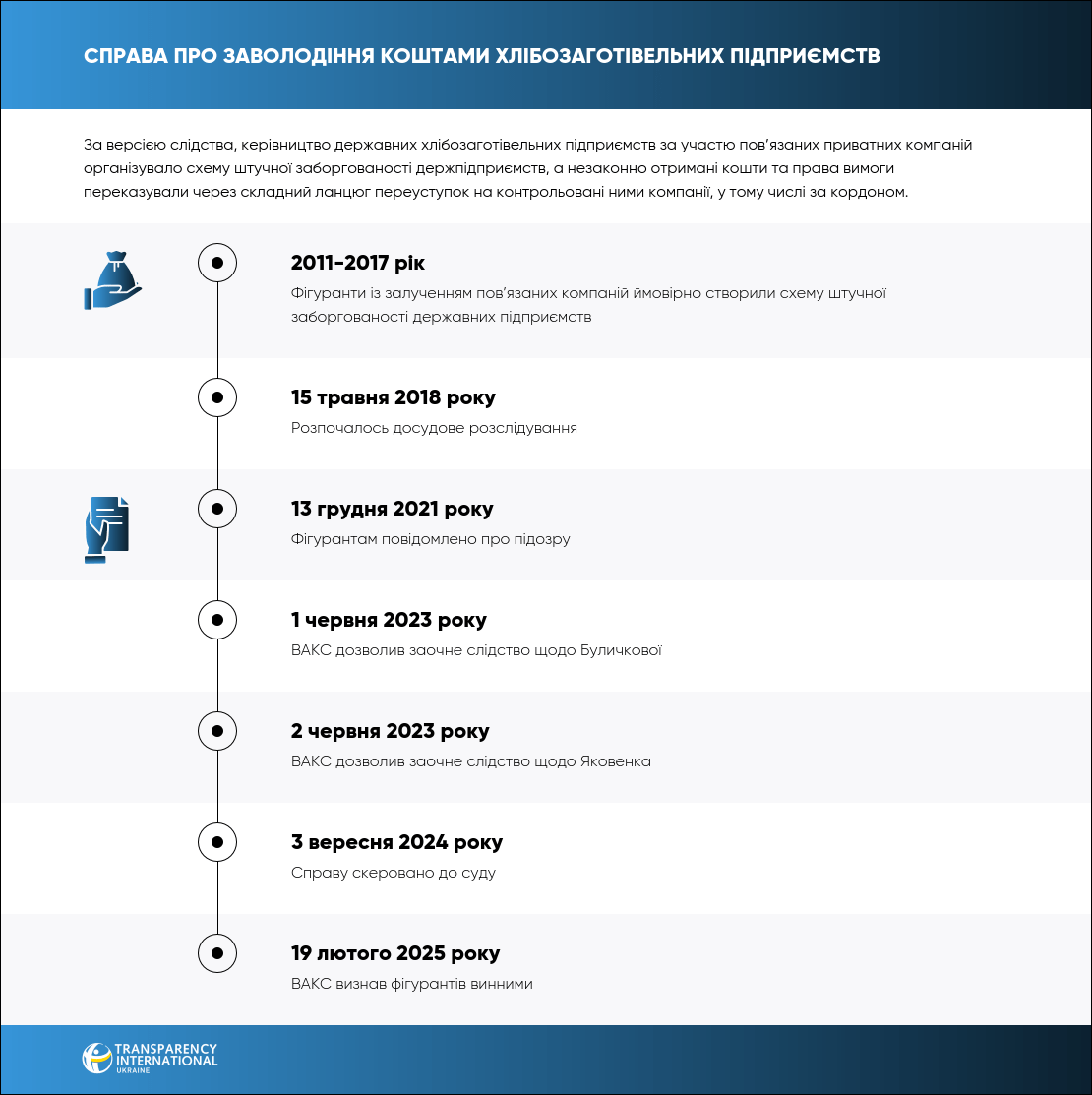 Фігурантам інкримінували ч. 5 ст. 191 КК України. ВАКС затвердив угоду та визнав фігурантів винними. Наразі вирок відсутній в реєстрі. Яковенку призначено 7 років позбавлення волі з випробувальним строком у 3 роки. Свистунову призначено 7 років умовного із іспитовим строком у 2,5 роки Гостренку, Буличковій, Могильному, Коростильову – 4 роки ув'язнення з іспитовим строком 2,5 роки;