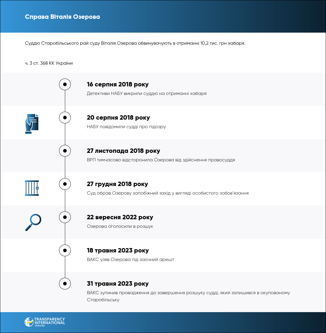 НАБУ та САП обвинувачують суддю Старобільського районного суду Луганської області Віталія Озерова в отриманні хабаря та зловживанні своїм службовим становищем.