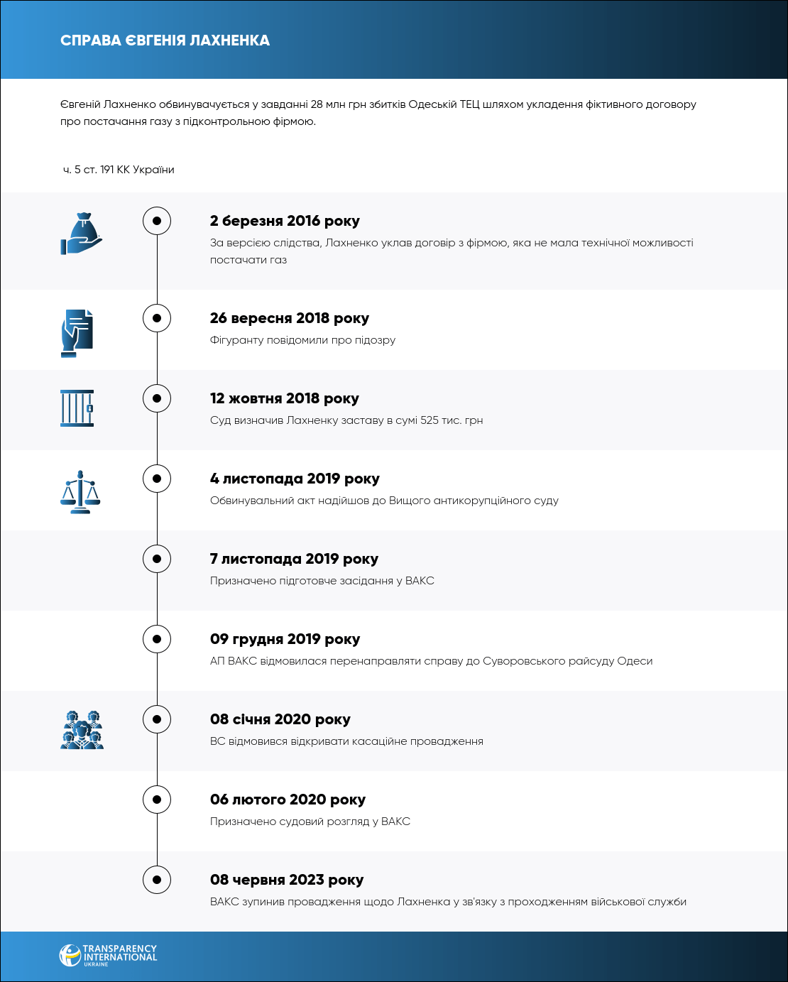 Лахненку інкримінують ч. 5 ст. 191 КК України. У разі обвинувального вироку на нього може чекати від 7 до 12 років ув’язнення, конфіскація майна та заборона обіймати до 3 років. Зараз кримінальне провадження зупинено, бо Лахненко проходить військову службу.