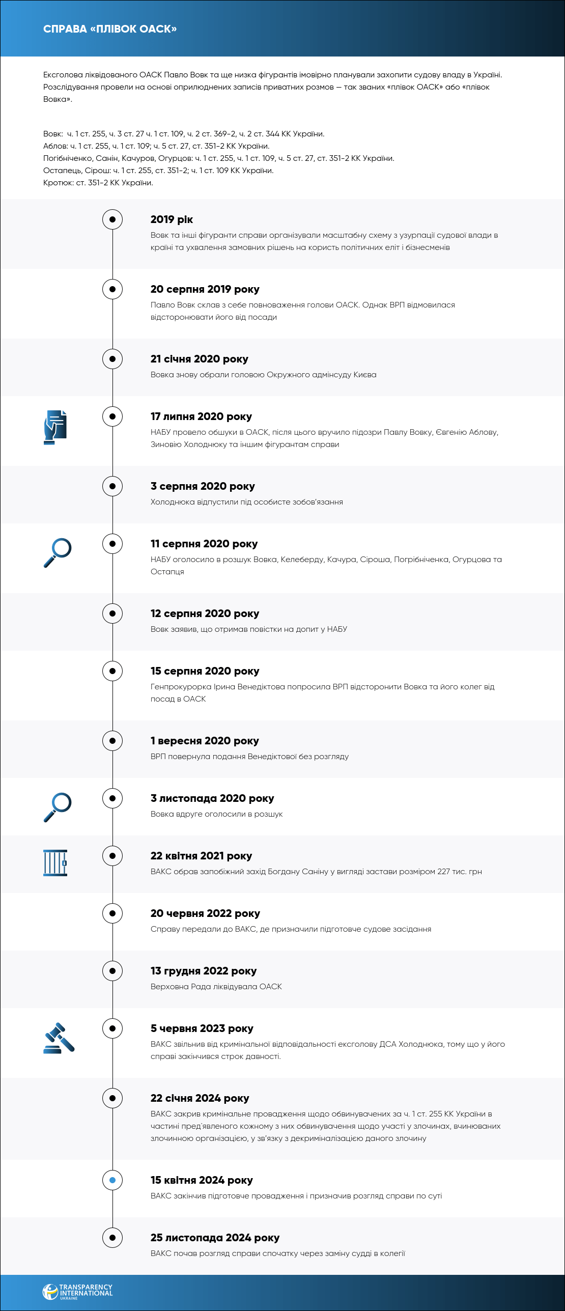 НАБУ-САП обвинувачують ексголову ліквідованого ОАСК Павла Вовка та ще низку фігурантів у створенні злочинної організації задля нібито захоплення судової влади. Розслідування провели на основі оприлюднених записів приватних розмов — так званих «плівок ОАСК» або «плівок Вовка».