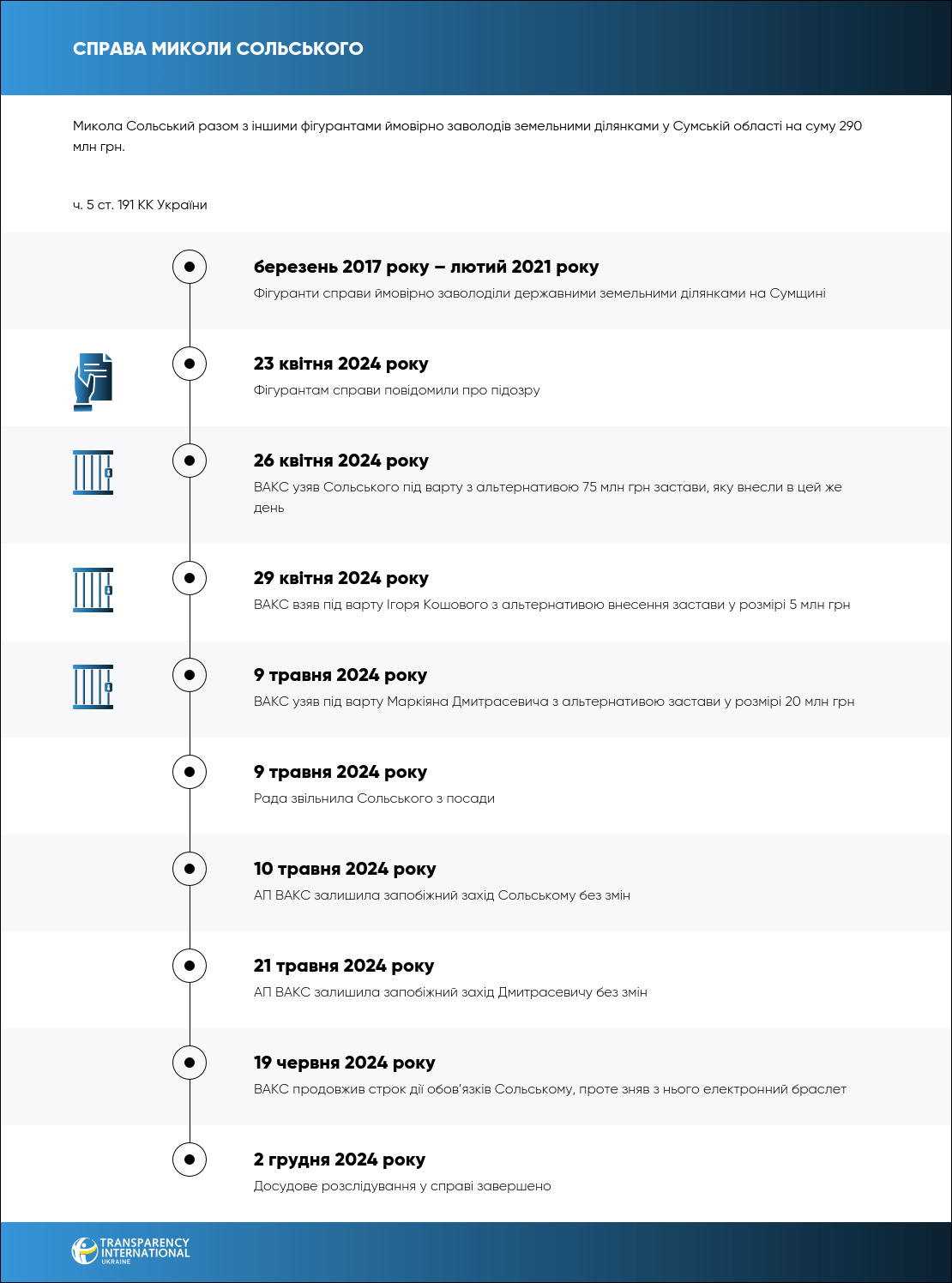 Інший співучасник Ігор Кошевий, який займався підбором учасників схеми, фактично отримував заробітну плату від Сольського. Також у справі фігурують ексголова Держгеокадастру Олександр Колотілін, довірена особа Сольського Микола Антонюк та директор приватної фірми Михайло Бугрименко. Дії фігурантів кваліфікували за ч. 5 ст. 191 КК України.
