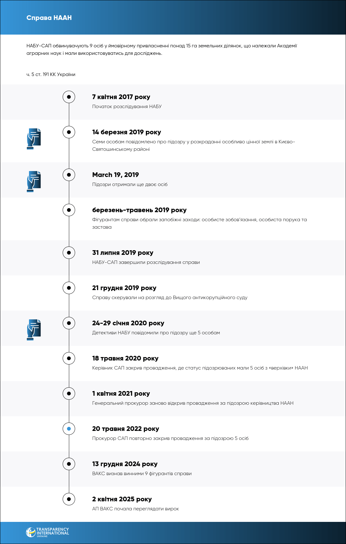 Дії фігурантів кваліфіковано за ч. 5 ст. 191 КК України. У січні 2020 року про підозру додатково повідомили п’ятьом топпосадовцям НААН. Однак у травні 2020-го керівник САП закрив провадження щодо «верхівки НААН», бо нібито забракло доказів, щоб довести їхні корисливі мотиви під час голосування. Більше про це читайте в нашій аналітиці про справу НААН.