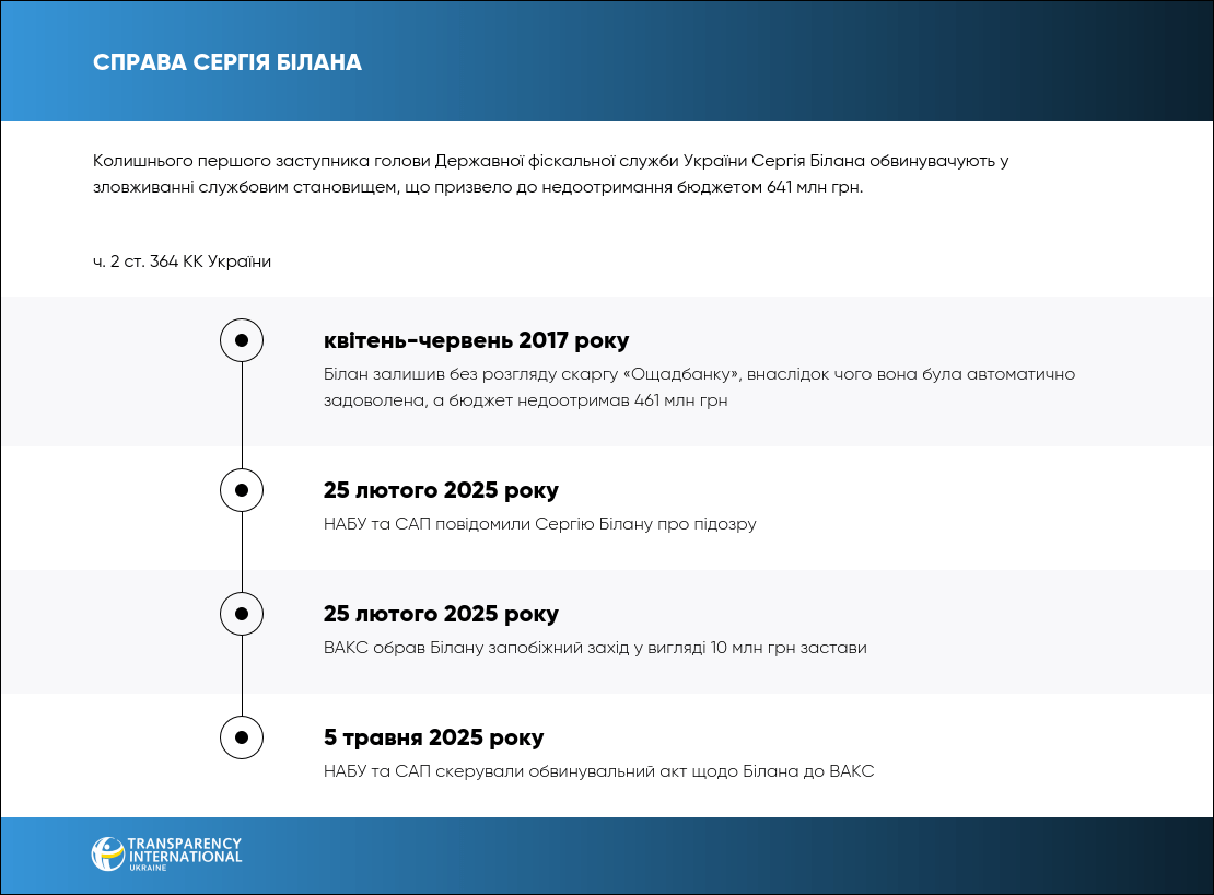 За версією слідства, у 2014-2016 роках низка службових осіб АТ «Ощадбанк», зловживаючи своїм службовим становищем, застосували понижену ставку податку з доходів підприємств-нерезидентів — замість 15% було застосовано ставку від 0 до 2% — та подали відповідну скаргу до ДФС. Посадовці ДФС, зокрема Білан, який був відповідальний за розгляд скарг від великих платників податків, умисно зволікав з підписанням рішення за скаргою «Ощадбанку». Як наслідок, вона була автоматично задоволена, на користь платника податку відповідно до норм Податкового кодексу України, а держава втратила можливість стягнути понад 641 млн грн. Слідство вважає, що це не було випадковістю, а наслідком змови посадовців ДФС з посадовцями АТ «Ощадбанк».