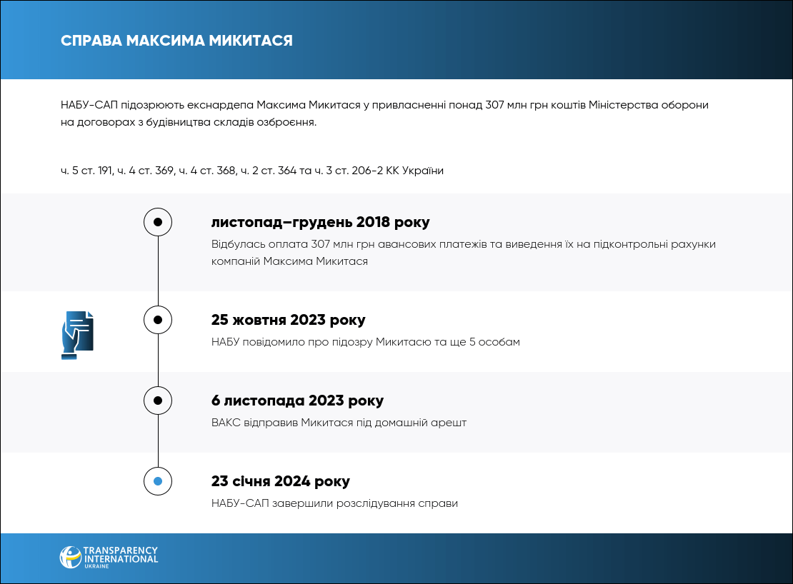 Це третя справа, в якій фігурує Максим Микитась. У 2019 році НАБУ оголосило про підозру Микитасю в заволодінні майном Національної гвардії на суму понад 81 млн грн. У 2022 році Микитасю повідомили про підозру в пропозиції надання €22 млн хабаря меру Дніпра Філатову.