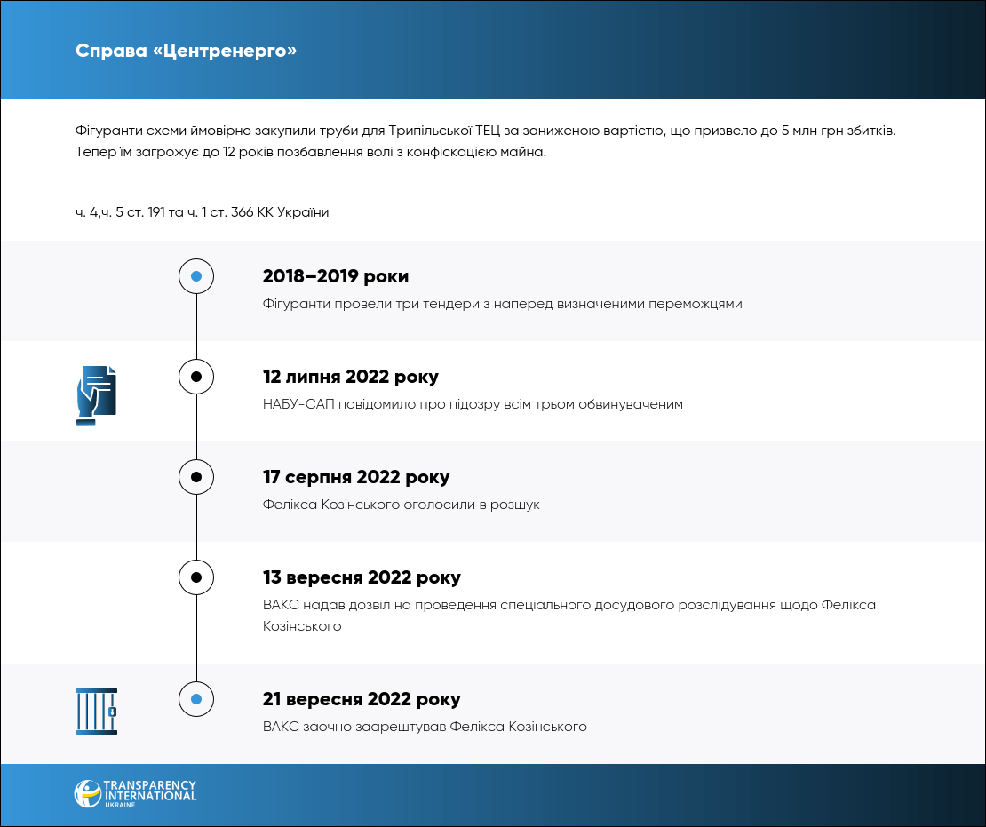 НАБУ обвинувачує заступника директора Трипільської ТЕС Дениса Ямпольського, начальника відділу «Центренерго» та власника однієї ТОВ Фелікса Козінського в проведенні закупівель за завищеними цінами. Бюджет зазнав понад 5 млн збитків.