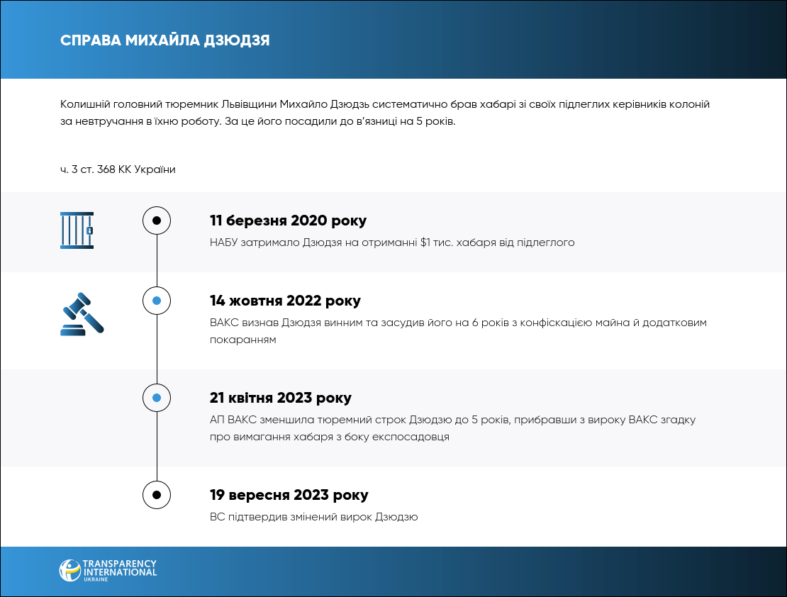 14 жовтня 2022 року ВАКС визнав винним ексочільника пенітенціарної служби Львівщини та депутата Львівської облради Михайла Дзюдзя в тому, що він систематично вимагав та отримував хабарі від підлеглих за невтручання в роботу. Його засудили на 5 років з конфіскацією майна.
