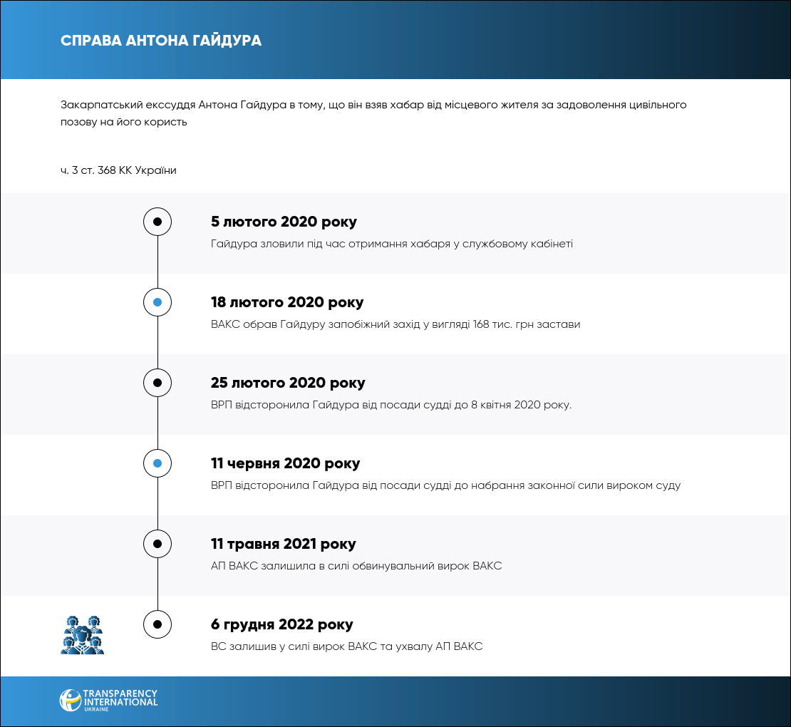 22 березня 2021 року ВАКС визнав закарпатського екссуддю Антона Гайдура винним у тому, що він взяв хабар від місцевого жителя за задоволення цивільного позову на його користь. Його засудили на 5 років в’язниці, позбавили права бути суддею на 3 роки, а все майно — конфіскували.