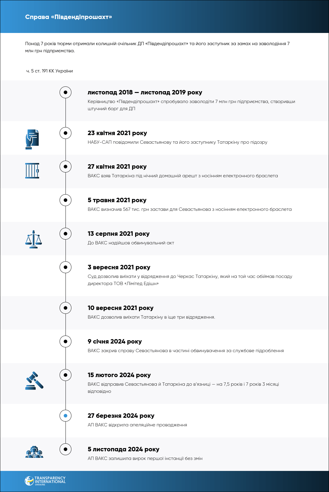 15 лютого 2024 року ВАКС визнав винними колишнього очільника «Південдіпрошахт» Юрія Севастьянова та його заступника Олександра Татаркіна у замаху на заволодіння 7 млн грн коштів підприємства. Обох засудили до понад 7 років у в’язниці.