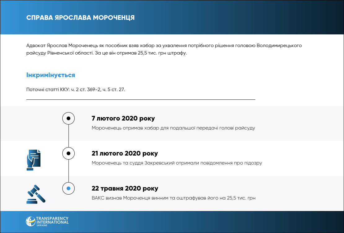 22 травня 2020 року ВАКС визнав винним рівненського адвоката Ярослава Мороченця у тому, що він як пособник взяв хабар за ухвалення потрібного рішення, кошти мав передати голові Володимирецького райсуду Рівненської області. За це адвокат отримав штраф.