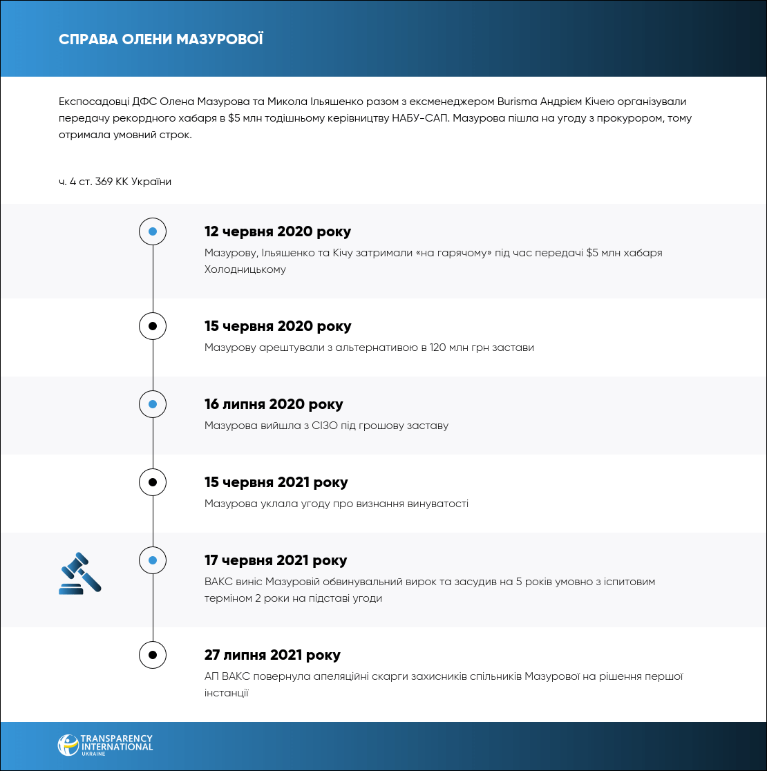 Дії Олени Мазурової кваліфікували за ч. 4 ст. 369 КК України. Вона уклала угоду про визнання винуватості, тож отримала покарання у вигляді 5 років умовного позбавлення волі з іспитовим строком 2 роки. Двоє її спільників заявили, що для них угода Мазурової стала своєрідним сюрпризом.