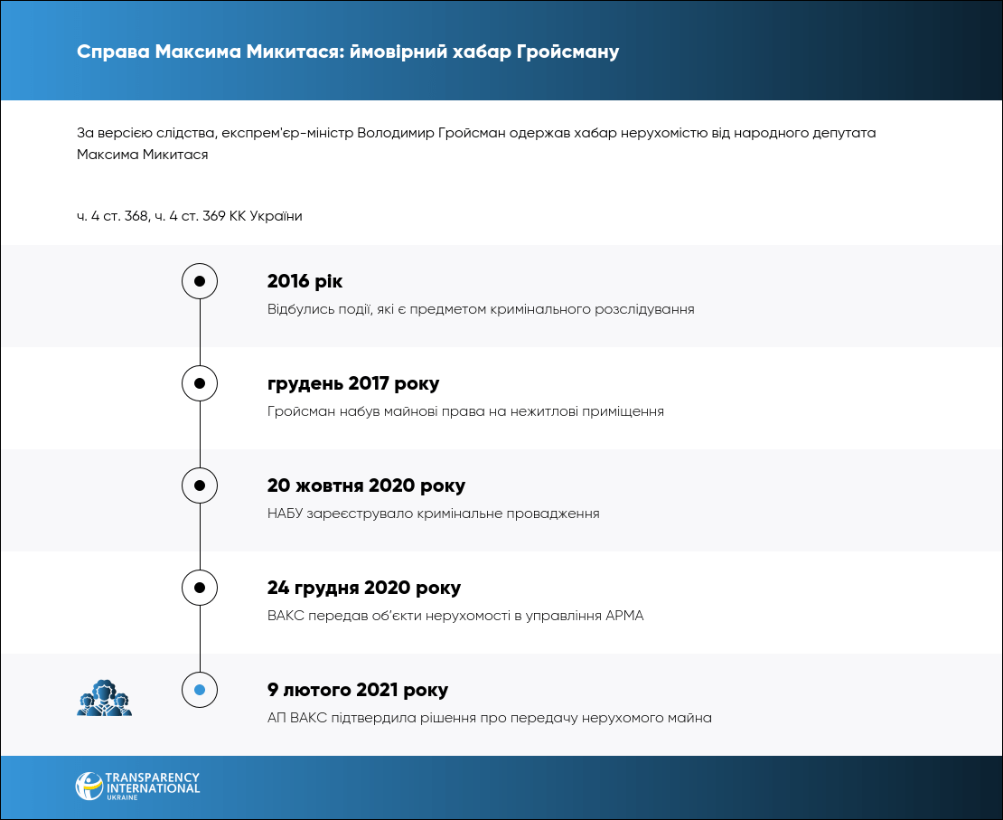 У жовтні 2020 року НАБУ зареєстрували кримінальне провадження в якому фігурує експрем'єр міністр Гройсман та ексдепутат Микитась. Наразі триває досудове розслідування.