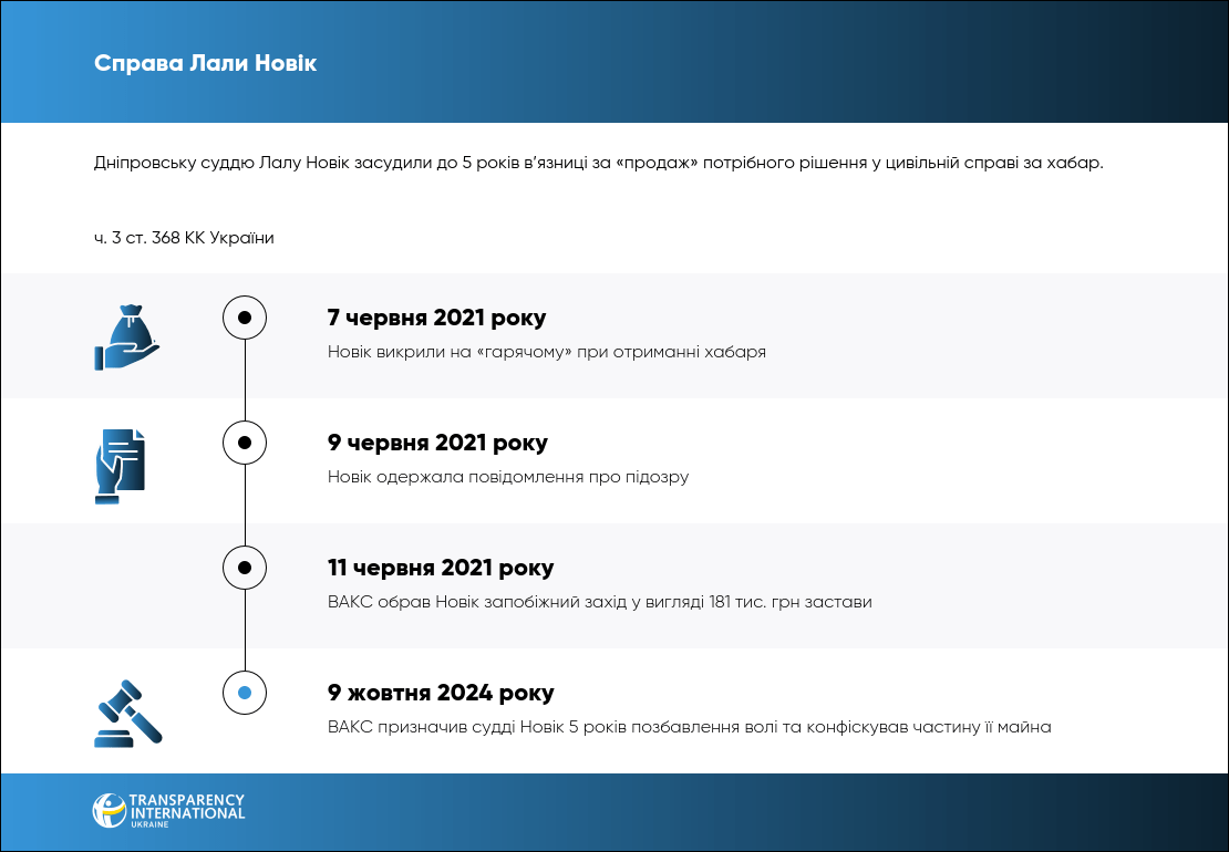 За матеріалами справи, суддя Дніпровського райсуду Дніпропетровської області Лала Новік отримала хабар розміром $2,5 тис. за те, що ухвалила рішення в інтересах фізичної особи у цивільній справі. Новік відсторонили від здійснення правосуддя.