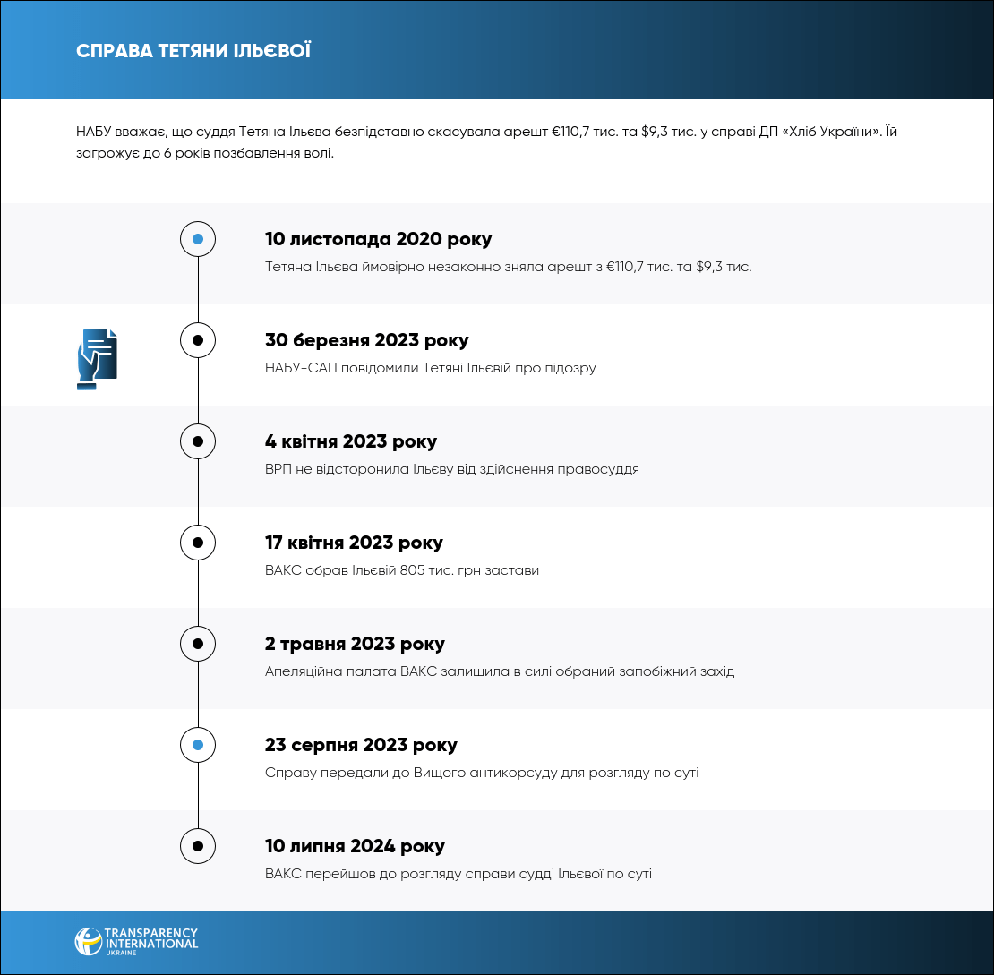 Суддю Тетяну Ільєву обвинувачують у незаконному знятті арешту з €110,7 тис. та $9,3 тис. у справі ДП «Хліб України» та внесенні неправдивих відомостей до ухвали суду.