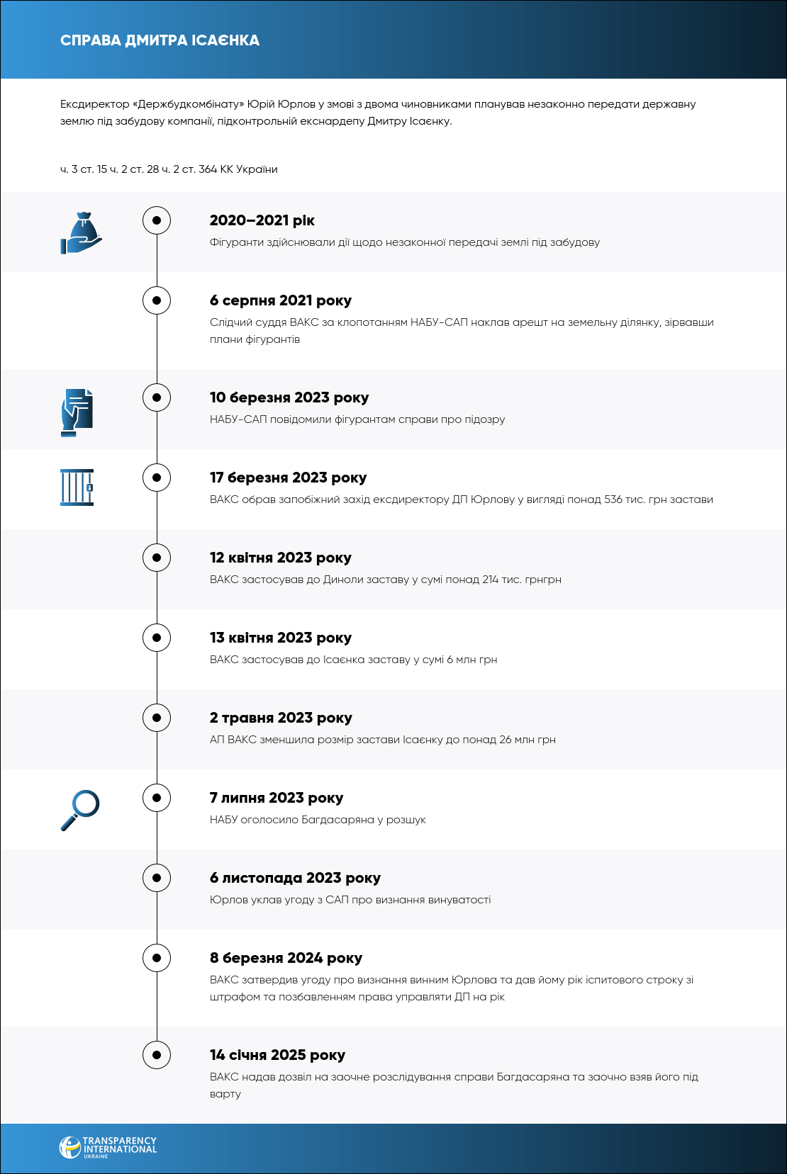 За версією обвинувачення, на початку 2020 року у нардепа Дмитра Ісаєнка виник план заволодіти ділянкою, на якій розташовувався «Держбудкомбінат», аби надалі побудувати там ЖК. Для цього він вступив у змову з на той момент радником директора комбінату Юрія Юрлова Олегом Динолою та тодішнім заступником керівника Апарату ВРУ Едуардом Багдасаряном, до сфери управління якого входило згадане держпідприємство.