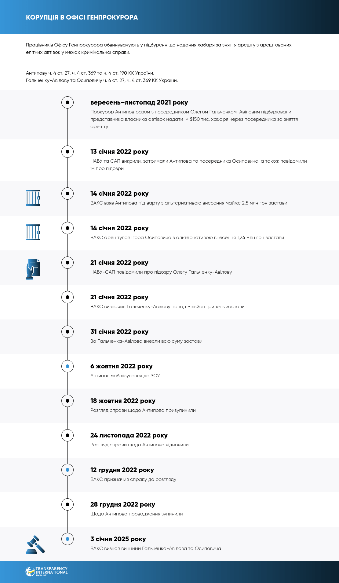 Антипову інкримінують ч. 4 ст. 27, ч. 4 ст. 369 та ч. 4 ст. 190 КК України. Гальченку-Авілову та Осиповичу інкримінують ч. 4 ст. 27, ч. 4 ст. 369 КК України.