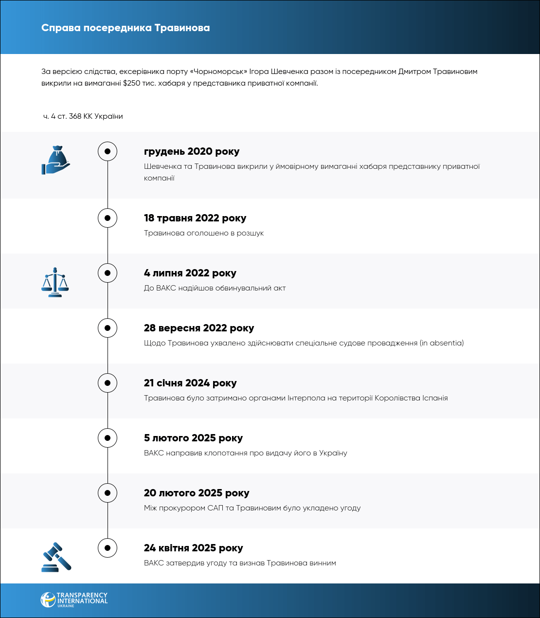 ВАКС визнав винним директора ТОВ «Автотехцентр» Дмитра Травинова в отриманні понад $250 тис. доларів хабаря у межах справи колишнього виконувача обов'язків керівника ДП «Морський торговельний порт “Чорноморськ”» Ігоря Шевченка.