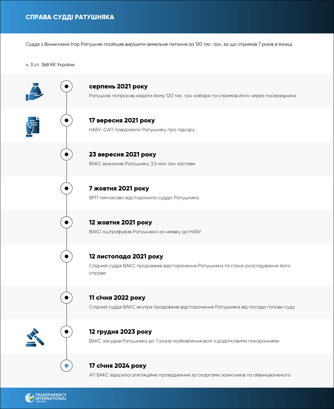 Дії судді кваліфікували за ч. 3 ст. 368 КК України. Ратушняка засудили до 7 років у в’язниці з конфіскацією частини майна та забороною обіймати посади в судах на 3 роки. На вирок подали апеляційну скаргу — її розгляд триває.