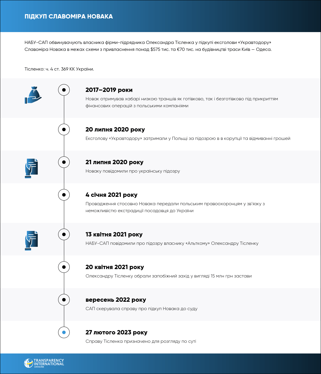 Як повідомили в НАБУ-САП, складність справи полягає в тому, що Новак отримував хабарі вже на території Польщі через складні ланцюжки. Зокрема, учасники тендерів «Укравтодору» поповнювали статутні капітали польських компаній, якими керували близькі та підконтрольні Новаку особи. Дії Тісленка кваліфікували за ч. 4 ст. 369 КК України.