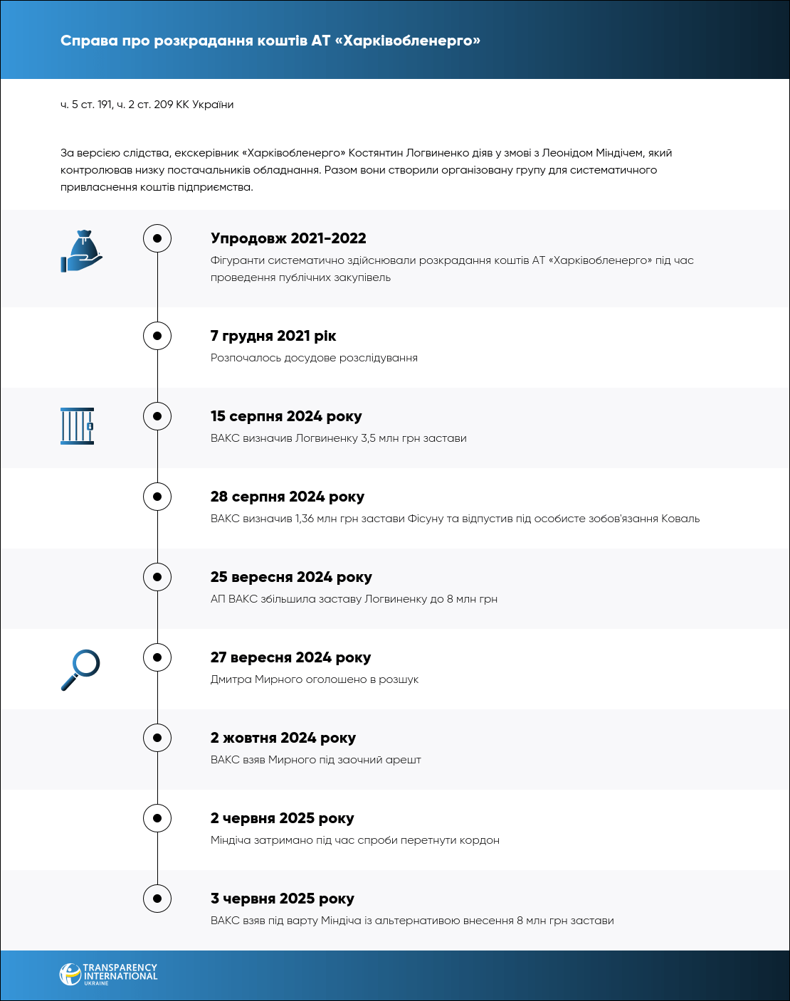 За версією слідства, у 2021 році тодішній в.о. генерального директора підприємства Логвиненко разом з Міндічем, який контролював низку приватних постачальників енергетичного обладнання, створили організовану групу з метою систематичного заволодіння коштами держкомпанії. До групи також увійшли співробітники «Харківобленерго» та пов’язані з ними представники приватного сектору.