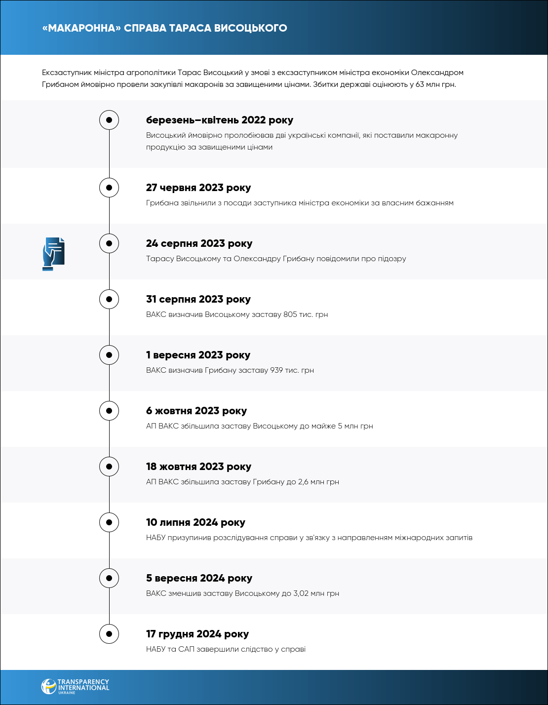 Слідство встановило, що протягом березня-квітня 2022 року Висоцький як перший заступник Міністра агрополітики ймовірно пролобіював дві українські компанії як постачальників макаронної продукції для низки військових адміністрацій. Ці компанії — ТОВ «Олімп» та ТОВ «Вінсайт Лайт».