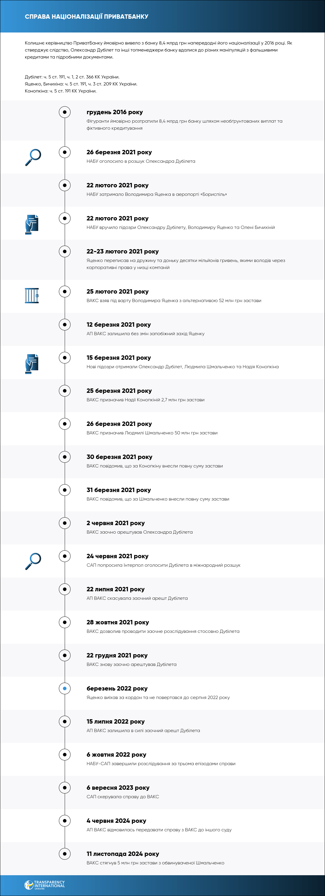 Справа містить три епізоди, пов’язані із виведенням коштів з банку напередодні його націоналізації в грудні 2016 року. Серед фігурантів — ексголова правління ПАТ КБ «ПриватБанк» Олександр Дубілет, його заступники Володимир Яценко та Людмила Шмальченко, а також колишні очільниці департаментів банку Надія Конопкіна, Олена Бичихіна та Наталія Онищенко.