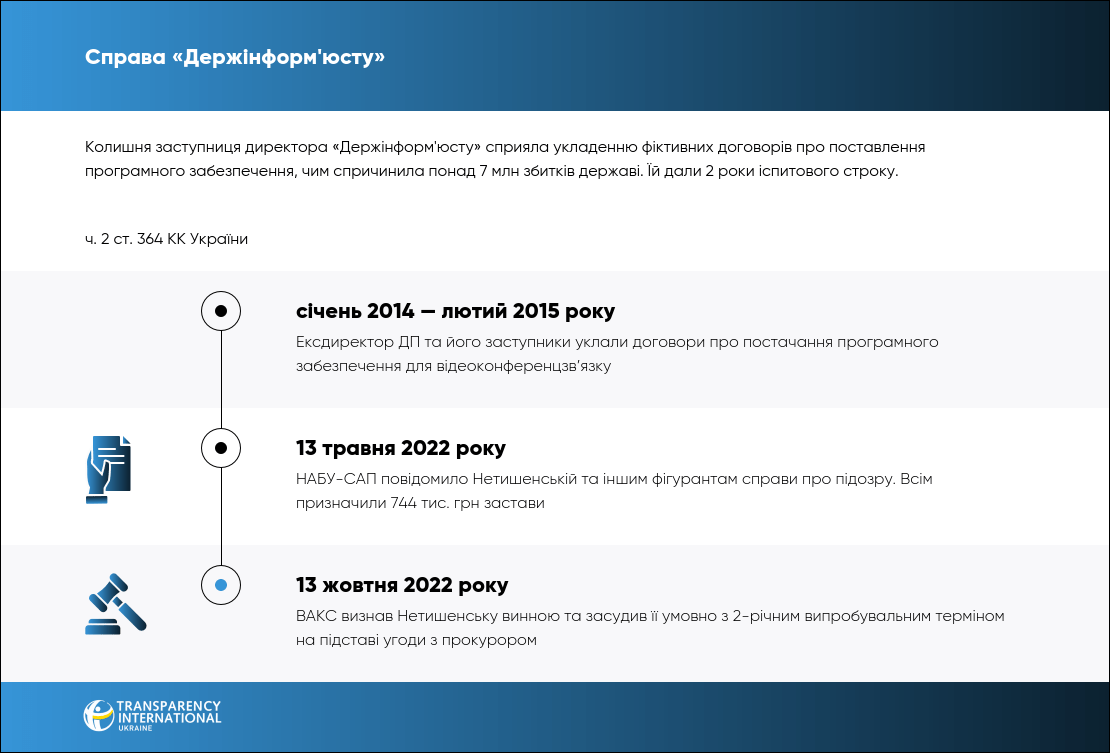13 жовтня 2022 року ВАКС визнав ексзаступницю директора ДП «Держінформ'юст» Олену Нетишенську винною в тому, що вона разом з ексдиректором уклала фіктивні договори та спричинила понад 7 млн грн збитків для підприємства. За це її засудили умовно.