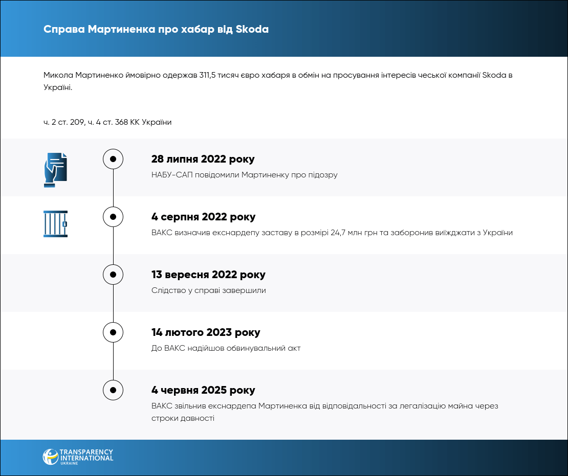 Колишнього нардепа Миколу Мартиненка обвинувачують в одержанні €311,5 тис. хабаря та легалізації цих коштів. З розслідування відомо, що Мартиненко отримав гроші від чеської компанії Skoda за просування її інтересів в Україні.