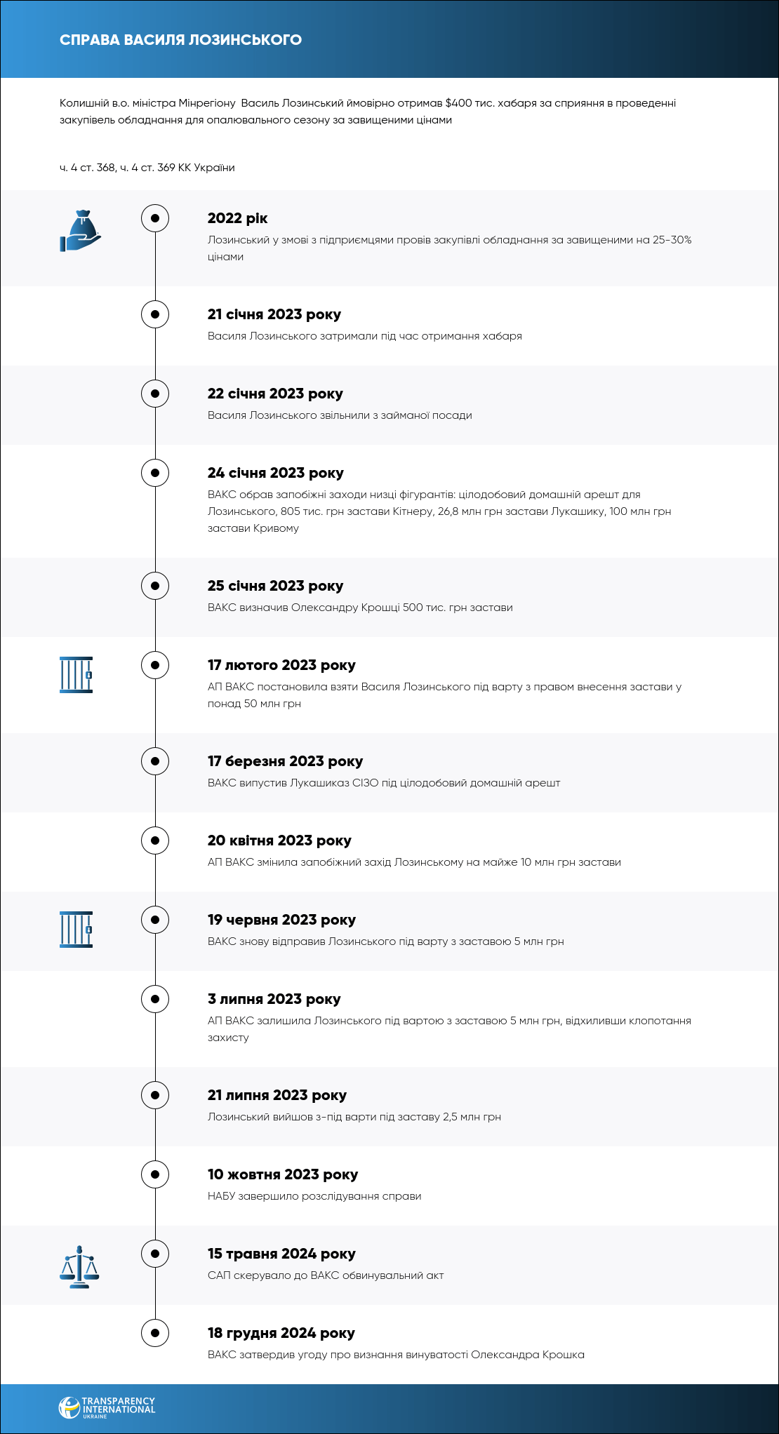 Лозинському та пособнику в отриманні хабаря інкримінували ч. 4 ст. 368 КК України. Дії інших фігурантів кваліфікували за ч. 3 ст. 28 ч. 4 ст. 369 КК України.