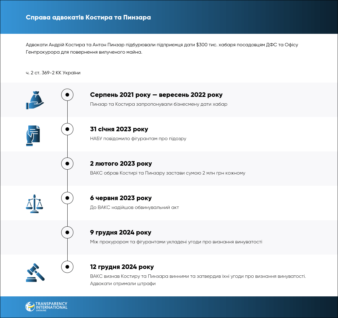 Адвокатам інкримінували ч. 2 ст. 369-2 КК України. Вони визнали свою вину, тож ВАКС на підставі угоди дав їм по 93,5 тис. грн штрафу.