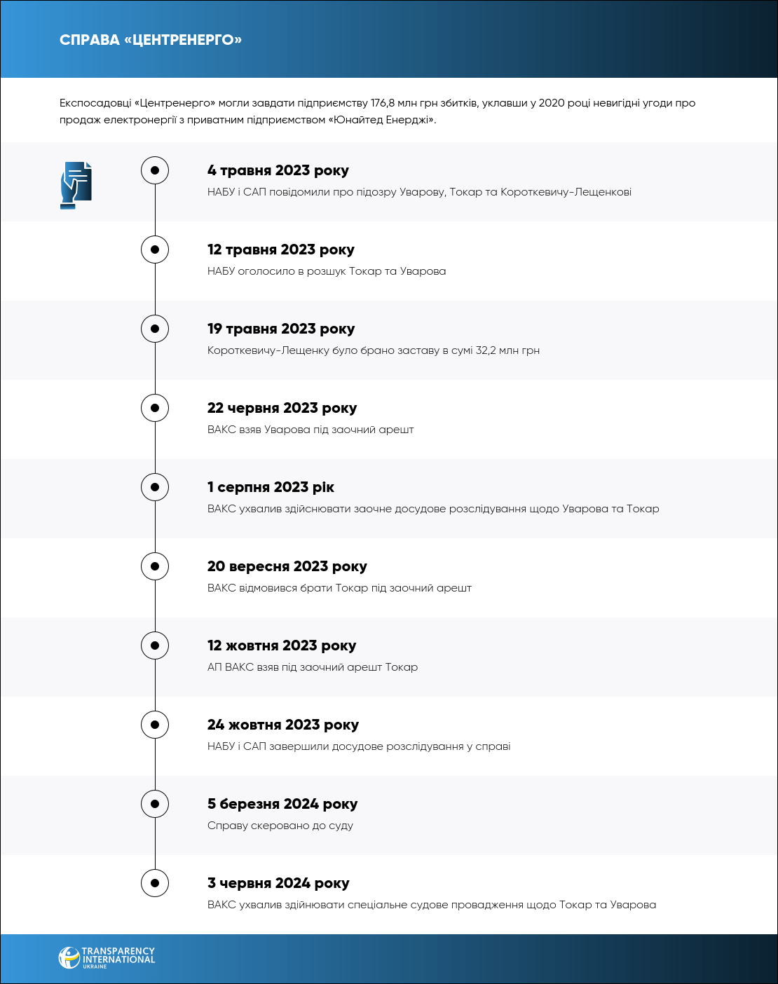 За версією слідства, у 2020 році колишній член дирекції ПАТ «Центренерго» Олександр Уваров та екскерівниця одного з департаментів Катерина Токар уклали договори про продаж електроенергії з ТОВ «Юнайтед Енерджі», яке представляв керівник Андрій Короткевич-Лещенко. За умовами аукціонів підприємство мало гарантовано відбирати встановлений обсяг електроенергії.