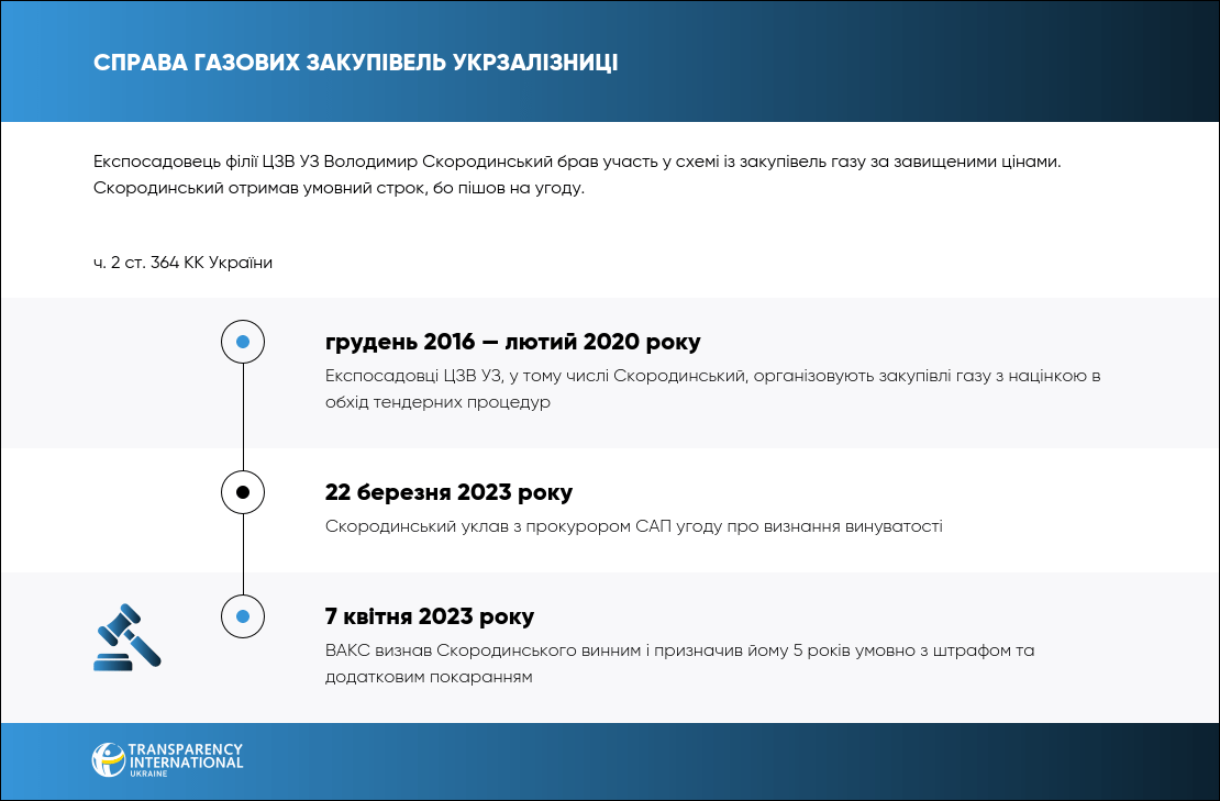 7 квітня 2023 року ВАКС визнав експосадовця «Центру забезпечення виробництва» АТ «Укрзалізниця» Володимира Скородинського винним у зловживаннях на закупівлі природного газу, що завдало державі 204 млн грн збитків. Його засудили умовно на підставі угоди з прокурором САП.
