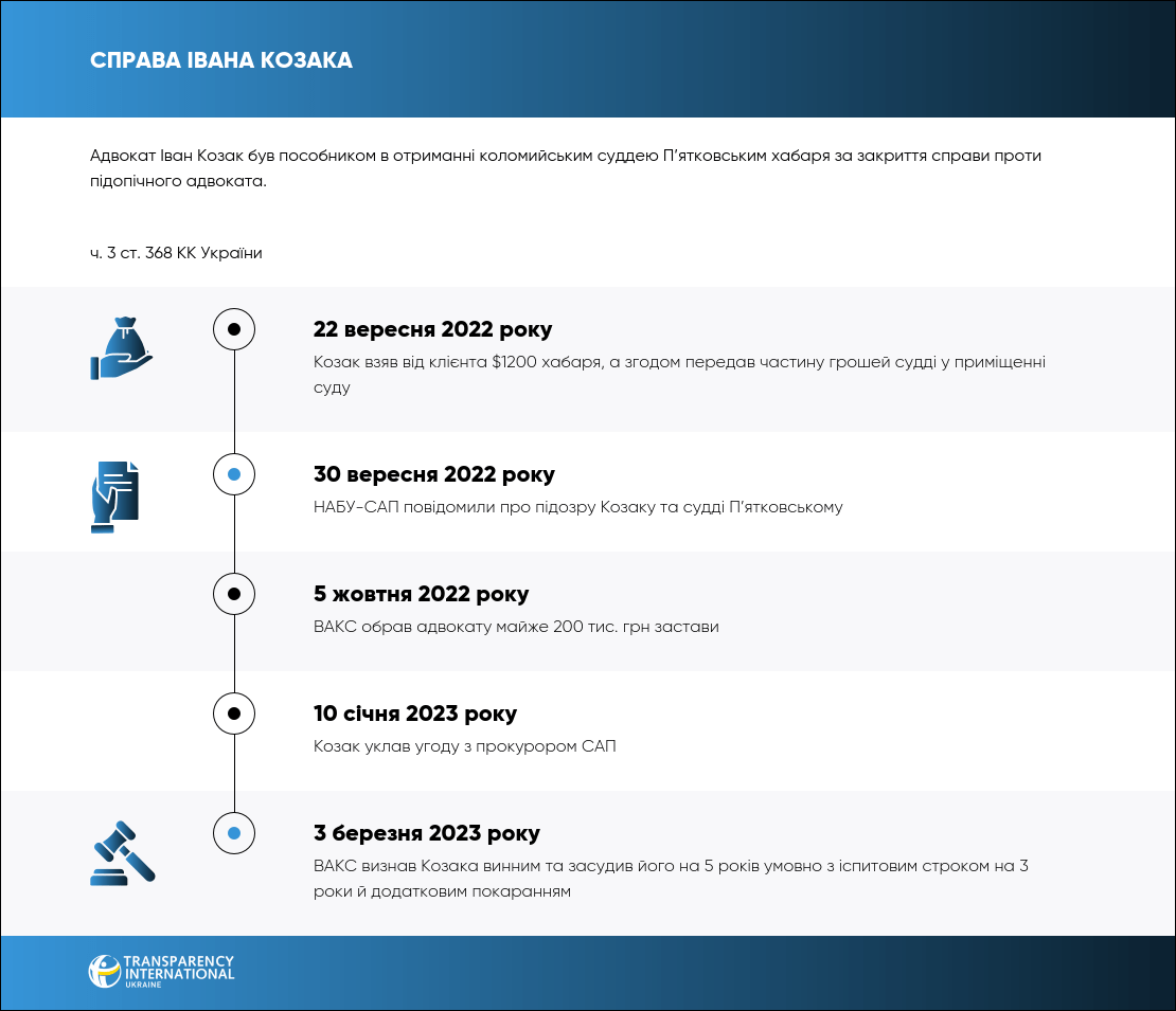 3 березня 2023 року ВАКС визнав винним адвоката Івана Козака, який був посередником у передачі хабаря передачі хабаря судді Коломийського суду Володимиру П’ятковському за закриття справи щодо клієнта адвоката. Козаку дали 5 років умовно.