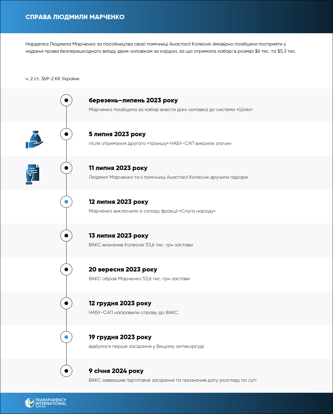 Слідство встановило два епізоди протиправної діяльності Марченко та її помічниці. У першому нардепка отримала $6 тис. за безперешкодний перетин кордону, а в другому — $5,3 тис. за внесення до системи «Шлях».