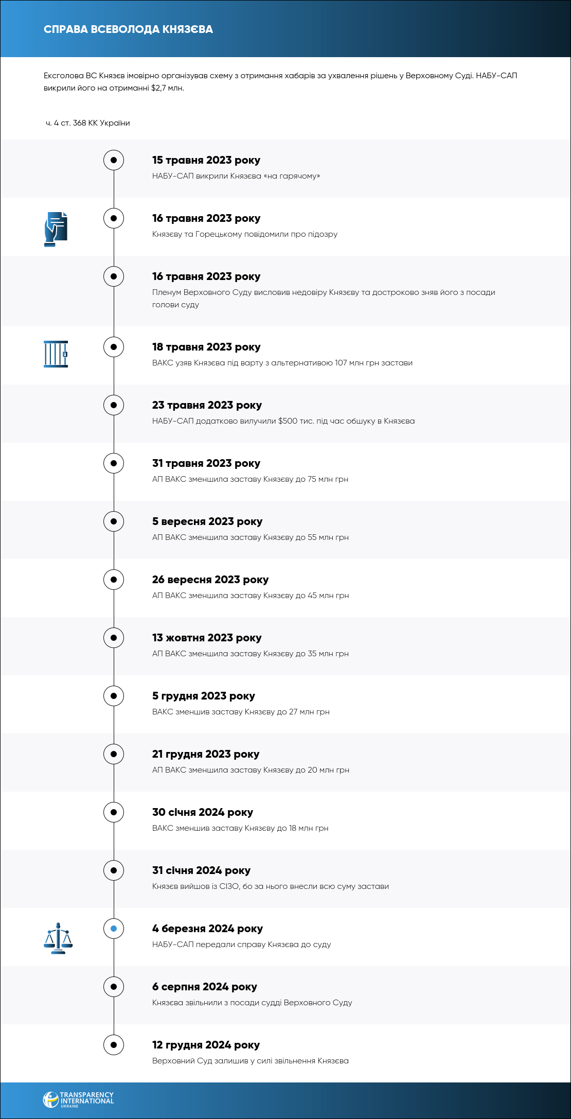 Всеволоду Князєву інкримінують ч. 4 ст. 368 КК України. З лютого 2024 року він відсторонений від здійснення правосуддя, доки не набере сили вирок Антикорсуду або ж доки справу проти судді не буде закрито. Ще раніше, майже одразу після вручення підозри, Пленум ВС зняв його з посади голови суду.