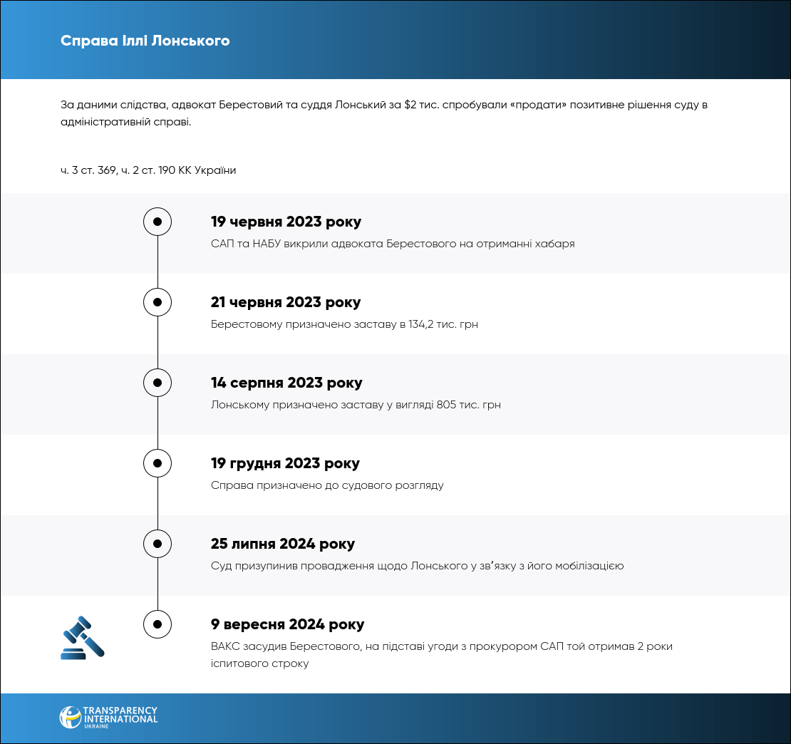 Дії Лонського інкримінують за ч. 3 ст. 369, ч. 2 ст. 190 КК України. У липні 2024 року суддя мобілізувався, тож через це провадження щодо нього було призупинено, а матеріали виділили окремо. окреме провадження.