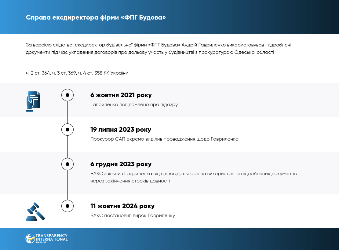 ВАКС звільнив від відповідальності ексдиректора ТОВ «ФПГ Будова» Андрія Гавриленко, раніше підозрюваного у великій справі мера Одеси Труханова та одеського бізнесмена Володимира Галантерника. Ідеться про оборудки з землею міста біля моря, в яких Гавриленка підозрювали у використанні підроблених документів.