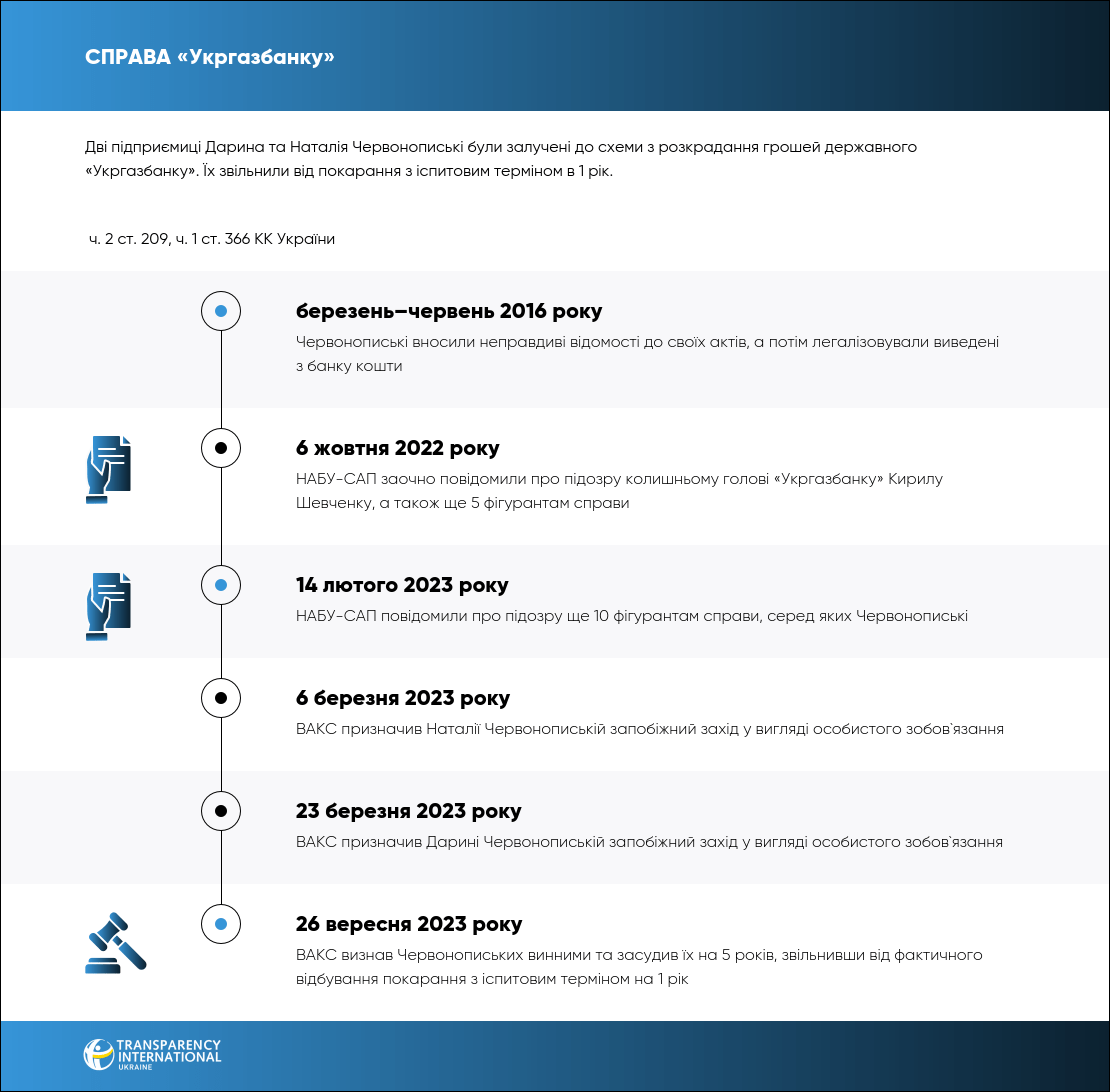 26 вересня 2023 року ВАКС визнав винними двох підприємиць, Дарину та Наталію Червонопиських. Їхні ФОП були залучені до схеми з розкрадання грошей державного «Укргазбанку», а самі жінки вносили неправдиві дані до актів. Їм призначили покарання у вигляді 5 років позбавлення волі, звільнивши від фактичного відбування покарання з іспитовим терміном на 1 рік.