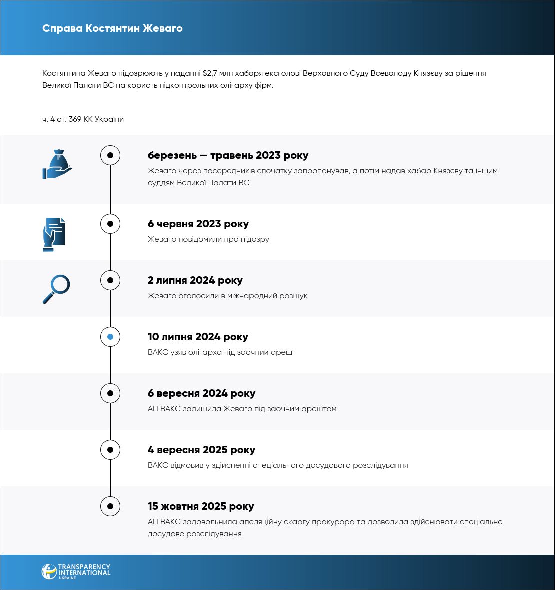 У травні він отримав обіцяні гроші — $1,35 млн. Правоохоронці кваліфікували дії Жеваго за ч. 4 ст. 369 КК України. Наразі олігарх перебуває у Парижі, куди виїхав ще у 2019 році.