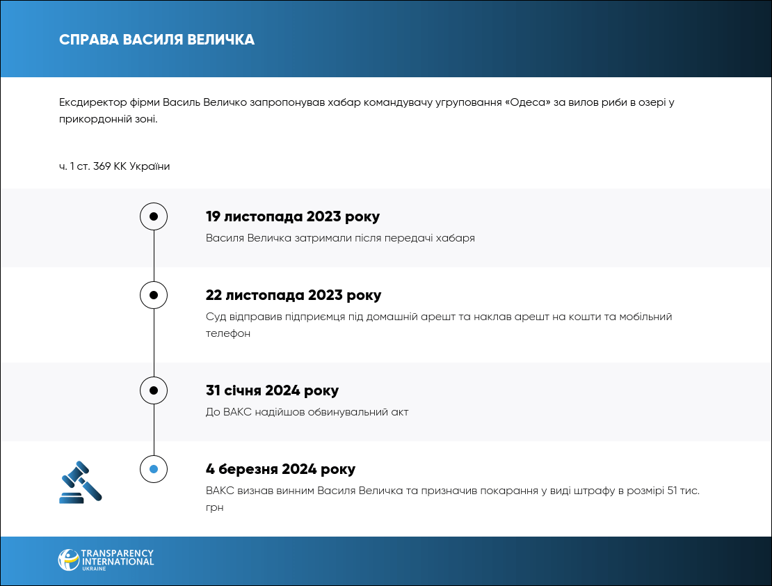 4 березня 2024 року ВАКС визнав винним ексдиректора ТОВ «ВМС-10» Василя Величка у вчиненні злочину та призначив йому штраф 51 тис. грн. Підприємець запропонував 200 тис. грн хабаря командувачу оперативного угруповання військ «Одеса» за дозвіл на вилов біоресурсів у прикордонній зоні.
