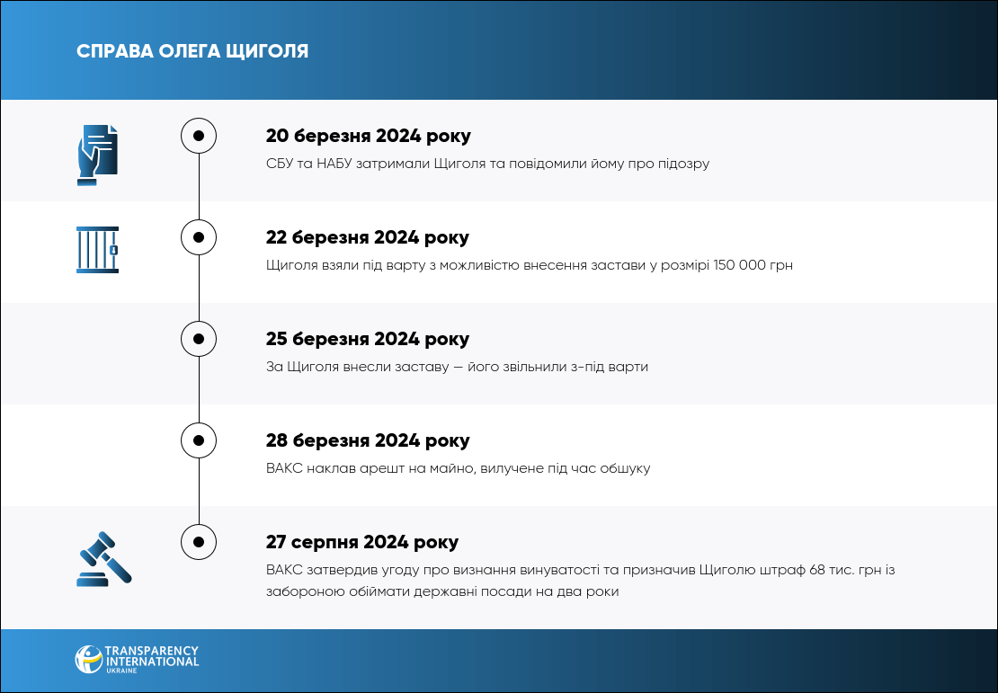 Олегу Щиголю інкримінують ч. 1 ст. 368 КК України. ВАКС затвердив угоду про визнання винуватості між прокурором САП та обвинуваченим. Суд визнав його винним та призначив покарання: штраф у розмірі 68 тис. грн з позбавленням права обіймати певні посади на два роки.
