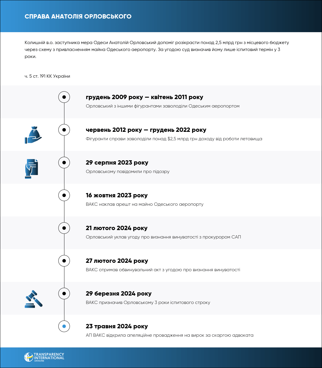 29 березня 2024 року ВАКС засудив колишнього в.о. заступника мера Одеси Анатолія Орловського, який взяв участь у заволодінні майном Одеського аеропорту. Експосадовець отримав 3 роки іспитового строку замість 4,5 року в’язниці, оскільки визнав свою вину та уклав угоду.
