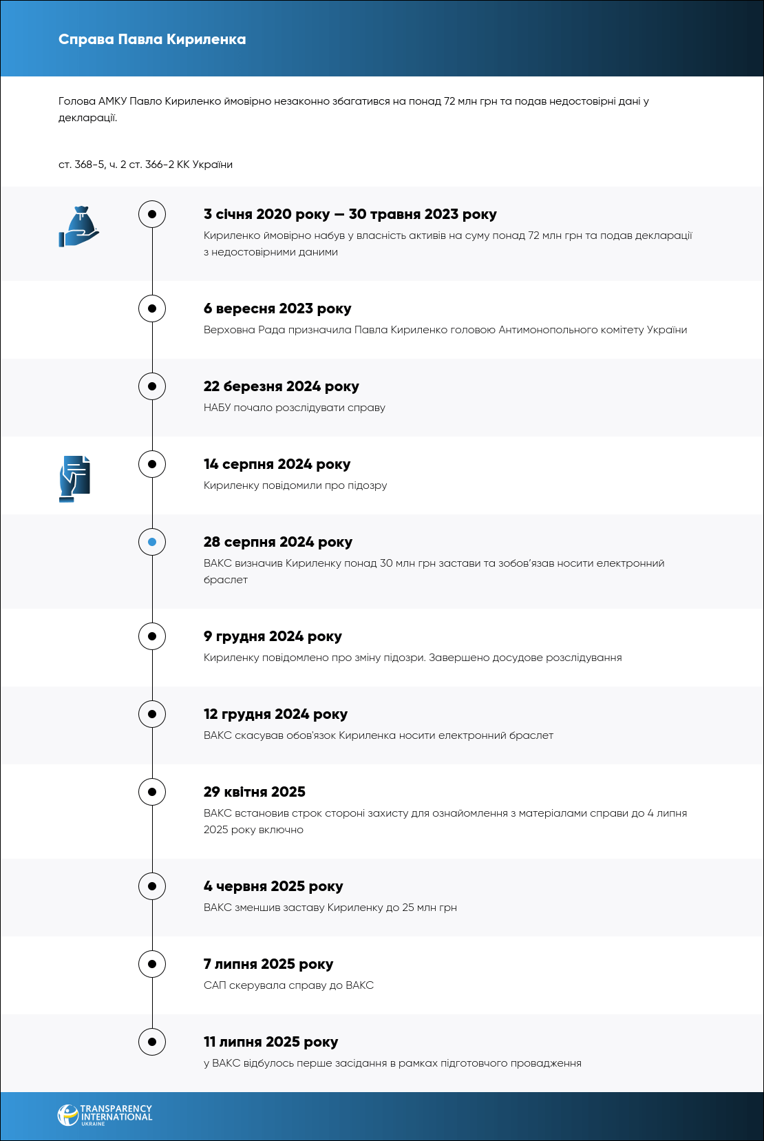 Дії Кириленка кваліфіковані за ст. 368-5, ч. 2 ст. 366-2 КК України. Дії його дружини за ч. 5 ст. 27 ст. 368-5 КК України.