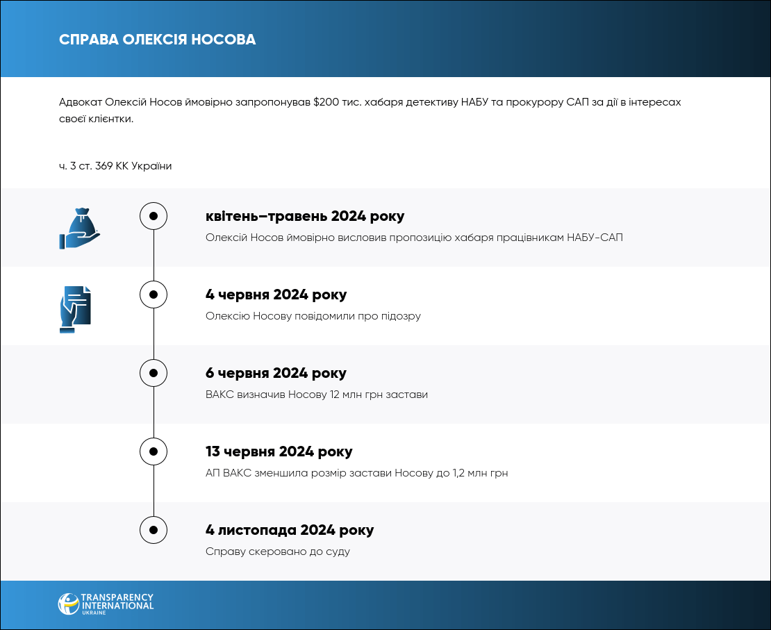 За версією слідства, передавати неправомірну вигоду Олексій Носов планував у два етапи: після виконання перших 4 пунктів надати $100 тис., а після передачі справи в поліцію — ще $100 тис.