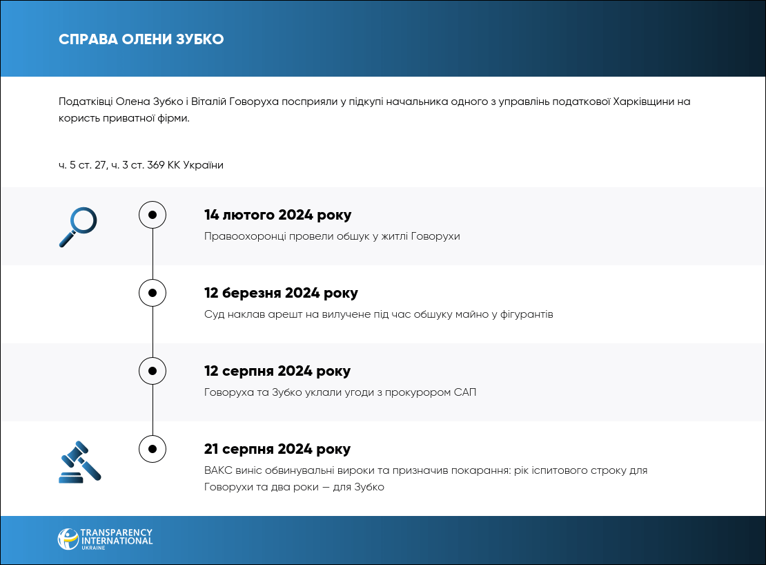 Дії Віталія Говорухи та Олени Зубко кваліфікували за ч. 5 ст. 27, ч. 3 ст. 369 КК України. Вони уклали угоди про визнання винуватості, тож замість 5 років в’язниці Говорусі призначили річний випробувальний термін, а Зубко — 2 роки випробувального.