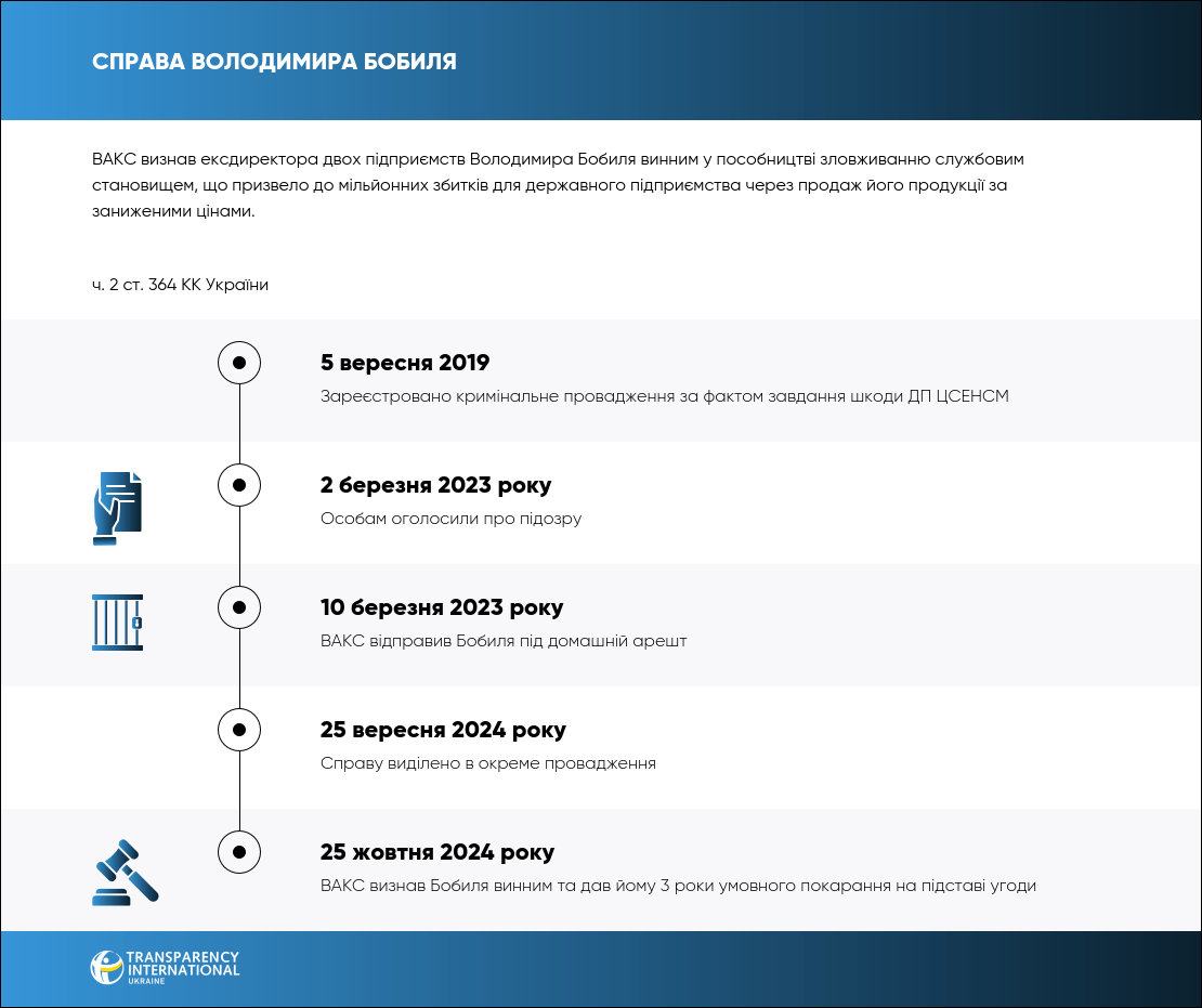 У суді Бобиль беззастережно визнав свою винуватість. ВАКС затвердив угоду про визнання винуватості та визнав Бобиля винним у вчиненні злочину, передбаченого ч. 2 ст. 364 КК України. Йому призначено покарання у вигляді 3 років умовного позбавлення волі з 2 роками іспитового терміну, із забороною протягом 2 років обіймати певні посади та штрафом у 8 500 грн. Також Бобиль зобов’язався перерахувати 100 тис. грн на рахунок держпідприємства ЦСЕНСМ.
