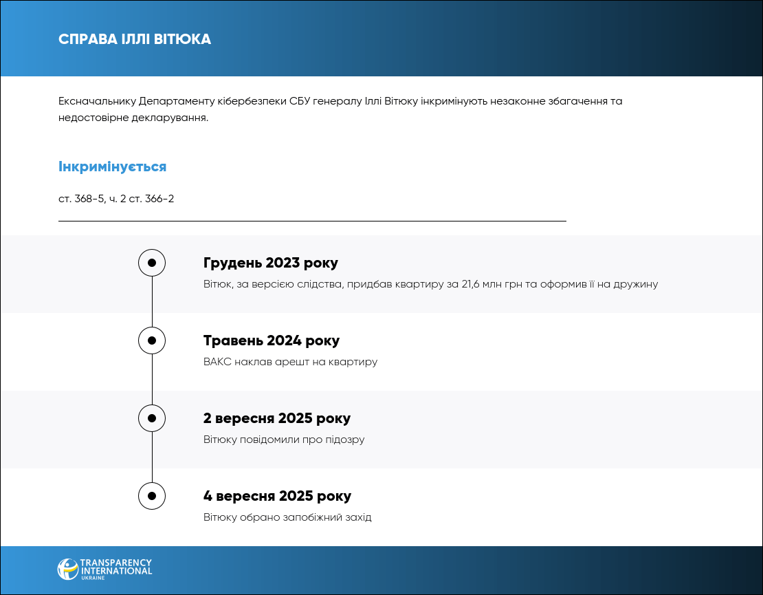 За версією слідства, у грудні 2023 року Ілля Вітюк придбав елітну квартиру в Печерському районі Києва за реальною вартістю 21,6 млн грн, але оформив її на свою дружину за заниженою договірною вартістю 12,8 млн грн.