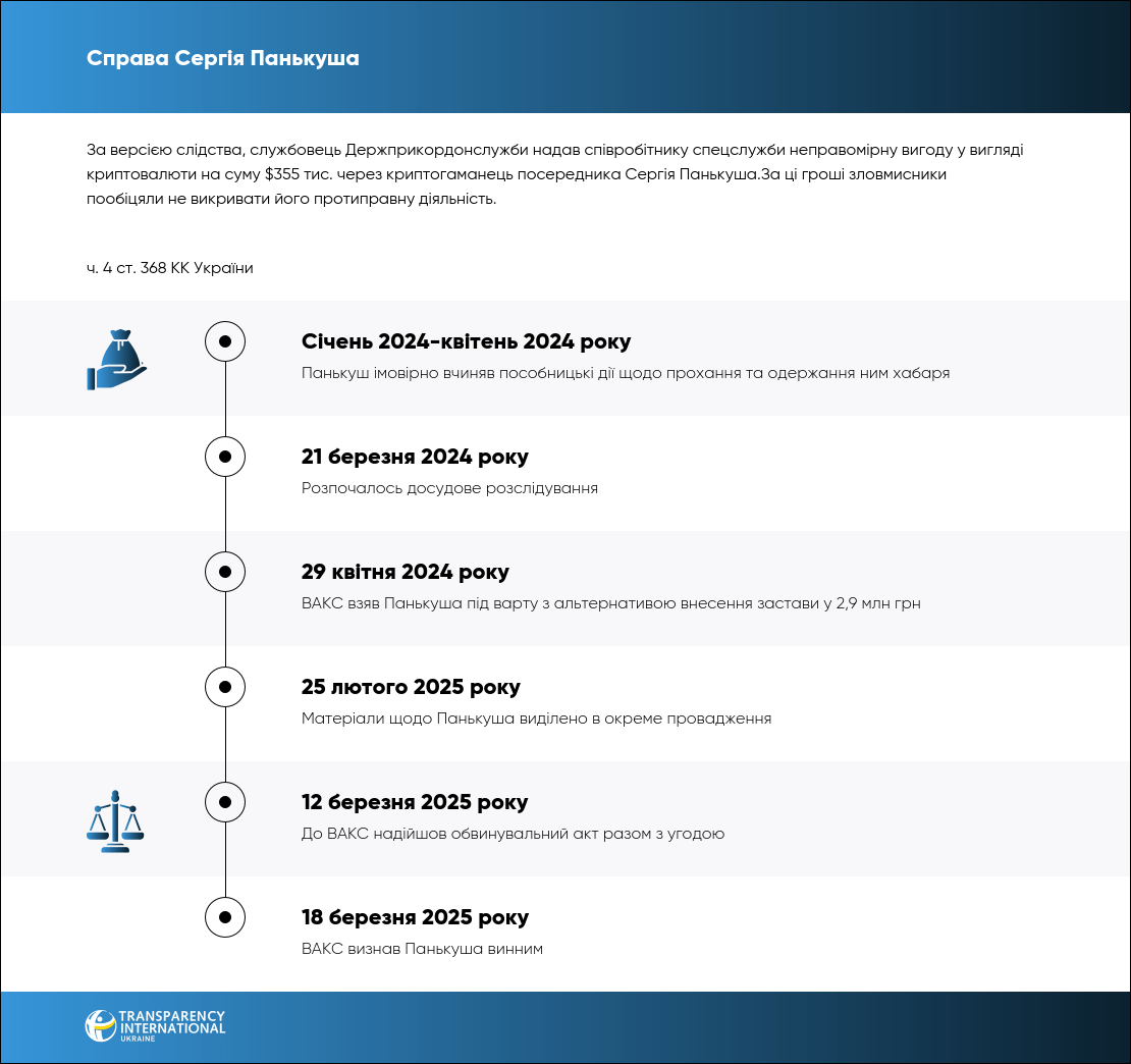 За версією слідства, співробітник Служби безпеки України дізнався про окремі факти, що могли вказувати на можливі правопорушення з боку одного з представників Державної прикордонної служби України. Надалі він вирішив використати ці відомості для особистого збагачення. Розуміючи, що для ефективної реалізації цього плану потрібен хтось, хто не привертає уваги та не асоціюється з правоохоронними органами, він залучив цивільного посередника — Панькуша.